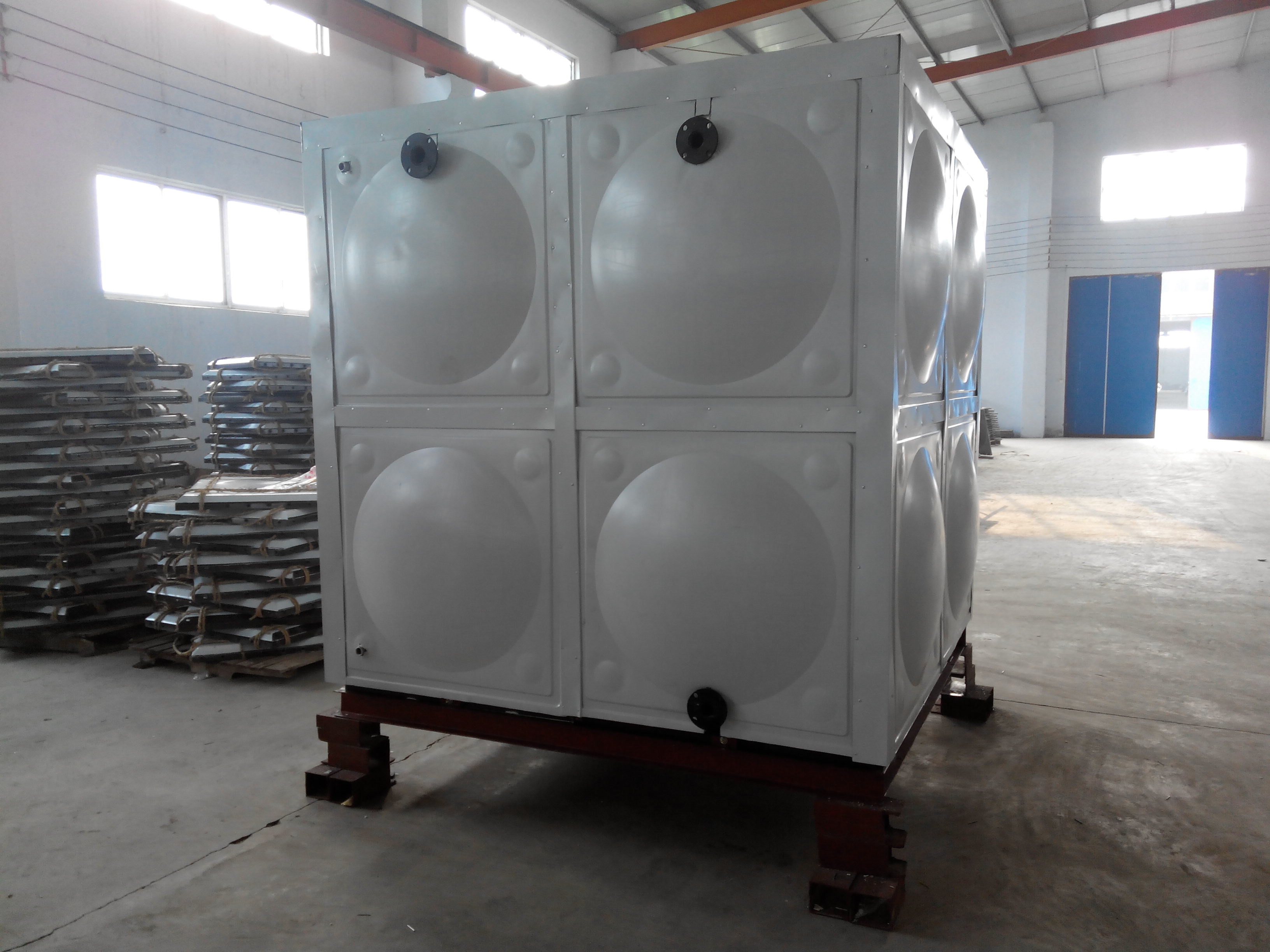 搪瓷水箱的貯水容積從1.0—1000立方米,可按用戶要求的尺寸生產組裝。它的板面有那些而致密釉層混合形成厚度約200-300微米的擴散層,加大了搪瓷面的附著強度。 搪瓷水箱的進水管、出水管及溢流管的管徑、位置由設計決定,水箱四周應有不少于600mm通道,箱底及箱頂不少于800mm,用槽鋼底架支撐箱底,內用不銹鋼拉筋加固,塊之間用橡膠條密封,用螺栓緊固,使之強度更大。