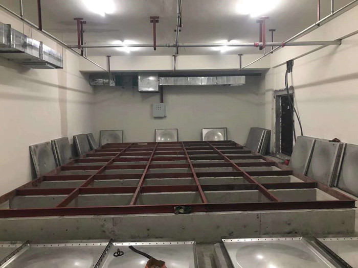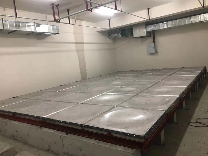 2.安裝水箱,在水箱板安裝之前,同樣按照發(fā)貨清單依次清點(diǎn),底板,側(cè)板及蓋板的數(shù)量及打孔是否正確。開始組裝底板,把板依次擺好,板與板中間夾好橡膠條,穿上螺栓,用電動扳手吧螺絲緊固好,把底板連接起來,放在焊好的槽鋼底座上。