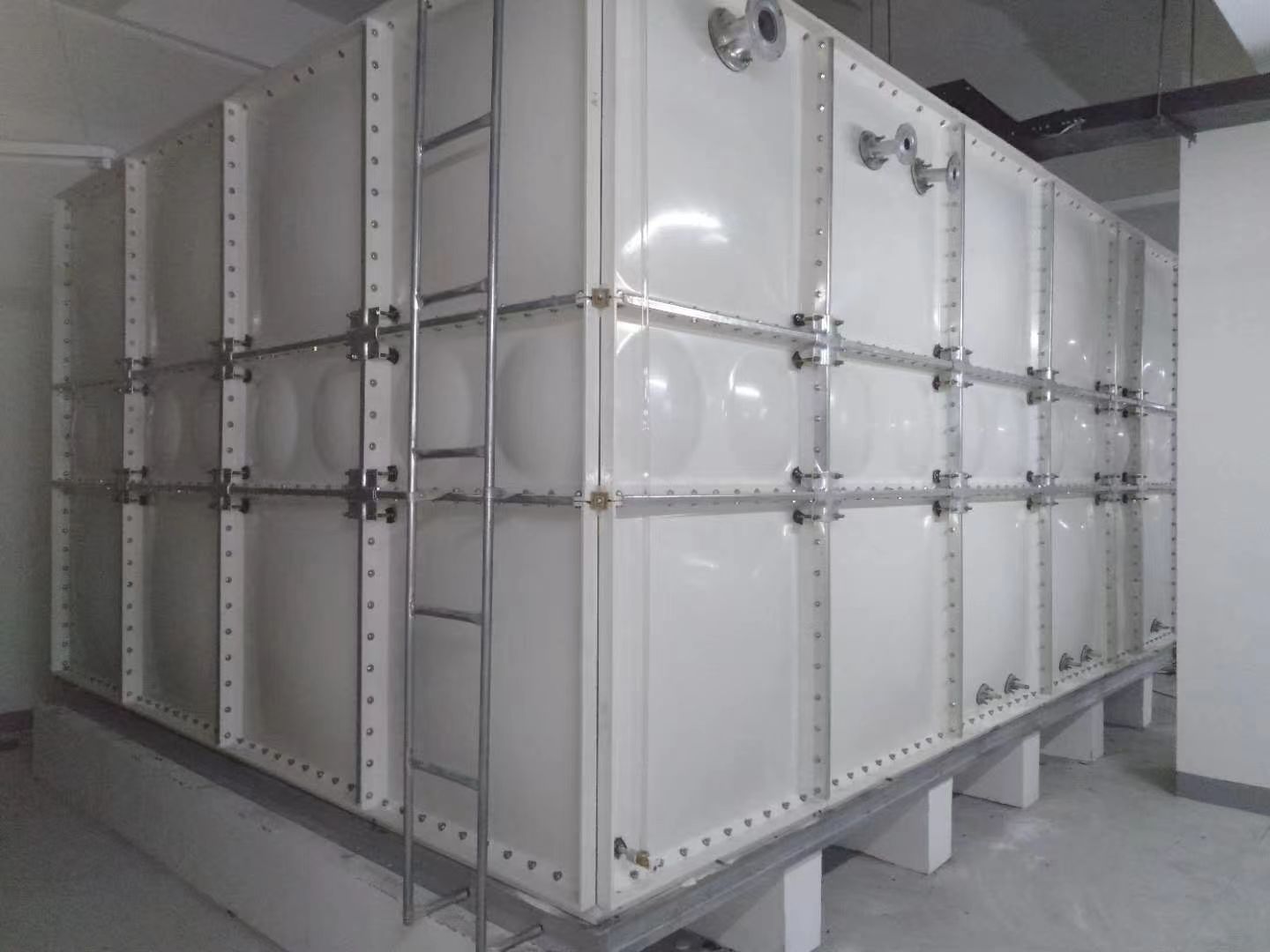 1、固定底板:將經檢測合格的玻璃鋼水箱底板點焊在槽鋼底 架上,要求固定于底架的中部,這樣更有利于固定。