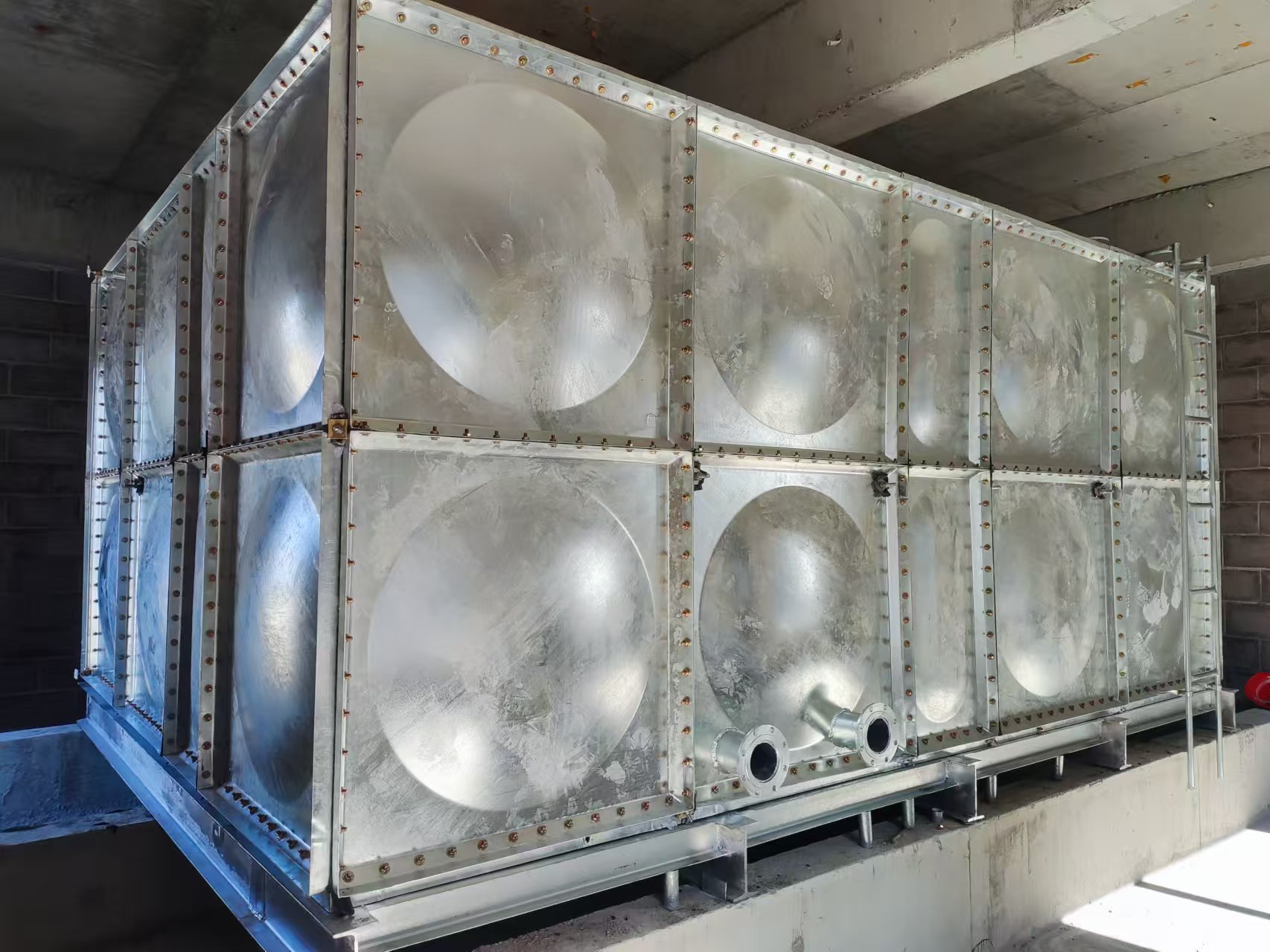 生活中咱們運用的鍍鋅水箱選用全螺栓連接,現(xiàn)場進行拼裝,拼裝快捷便利,拼裝時選用專用密封條密封,不會出現(xiàn)漏水及密封不嚴現(xiàn)象。鍍鋅水箱體內(nèi)有著特殊性拉桿結構,使力學性能更合理,高度可到達5米。鍍鋅水箱對安裝現(xiàn)場無特殊要求,無需吊裝設備,容積可滿足用戶全部要求,二十四小時不漏水為合格。